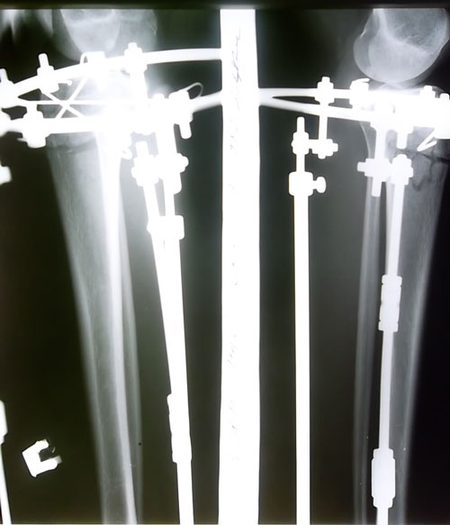 Через некоторое время я опять встала, было ощущение, как будто спица внутри ноги играет как струна, неприятное бренчание. Пришел Константин Николаевич, я рассказала ему о своих переживаниях. Он проверил аппарат, спицы, болты. Оказалось, что один верхний болтик раскрутился и болтался, возможно из за этого был такой лязг. После подкручивания ходить стало легче и психологически спокойнее)))))