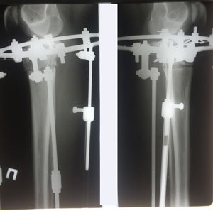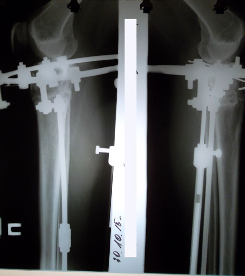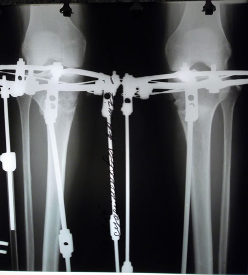 После того как левая коленка стала разгибаться, из спицы на левой ноге верхнего кольца стала выходить бесцветная, желтоватая жидкость –лимфа.